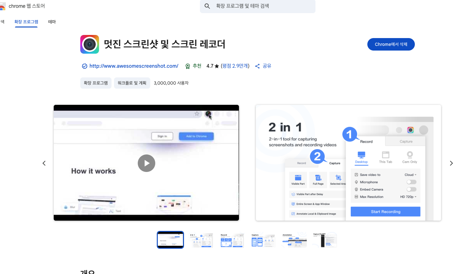 | Awesome Screenshot & Recorder | 화면 캡처 + 화면 녹화 | 영역 지정 캡처, 전체 페이지, 탭 녹화(음성 포함) 지원. 구글 계정 연동 가능. |