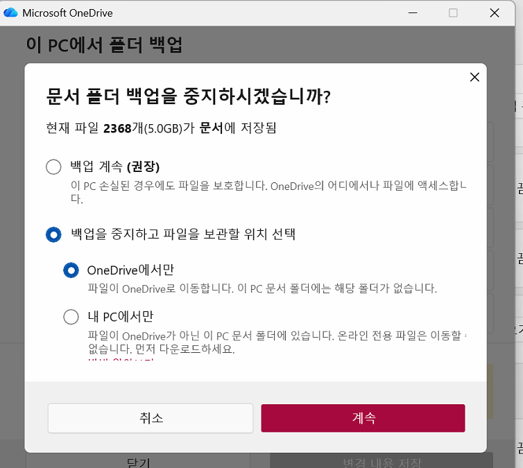 - 바탕화면·문서·사진 중 백업 중인 항목이 있는지 확인