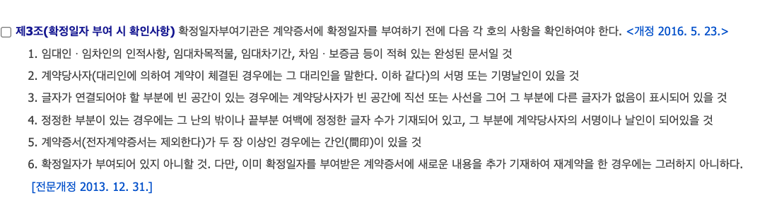 위와 같은 사항을 모두 충족한 계약서에 한하여 확정일자 부여가 가능하므로, 계약 체결 후 확정일자 신청 전 반드시 위 요건을 확인하는 것이 바람직하다.
