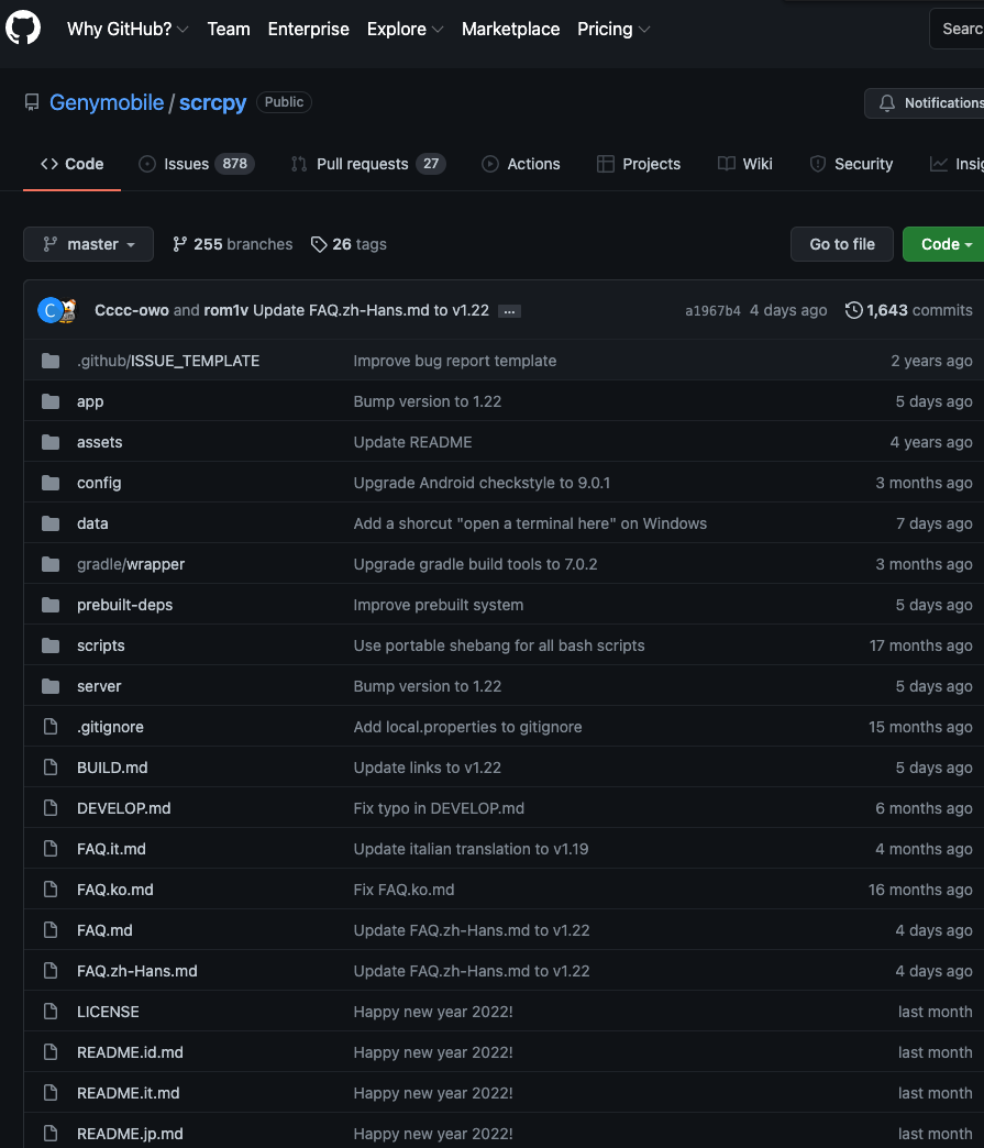 먼저 구글에 scrcpy를 검색해주어서 나오는 링크에 들어가면 github.com 웹페이지의 링크가 나온다.