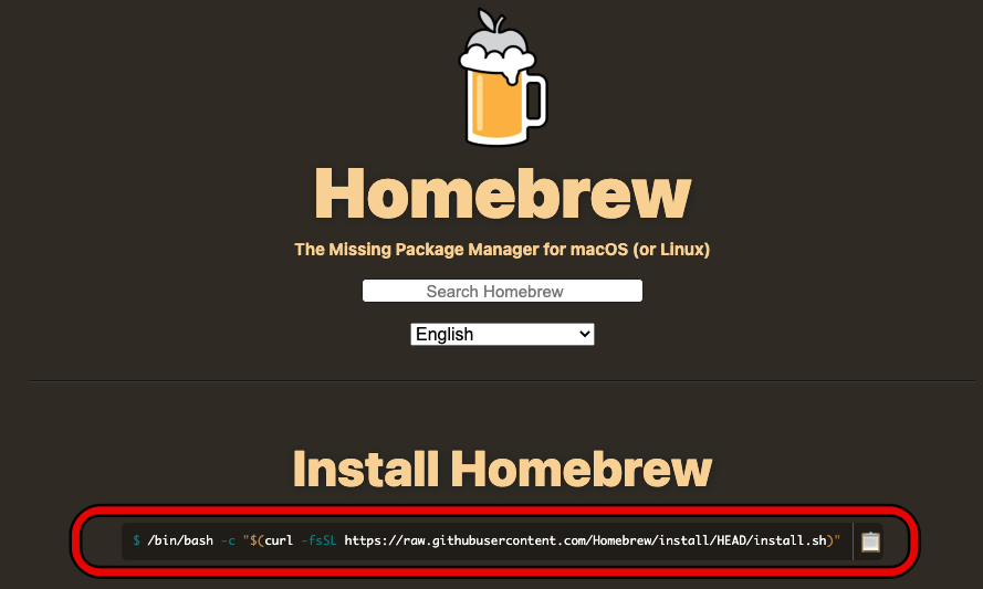 그럼 다음과 같은 사이트가 열리는 데 아래의 그림처럼 install Homebrew밑에 나온 명령어를 복사해준다.