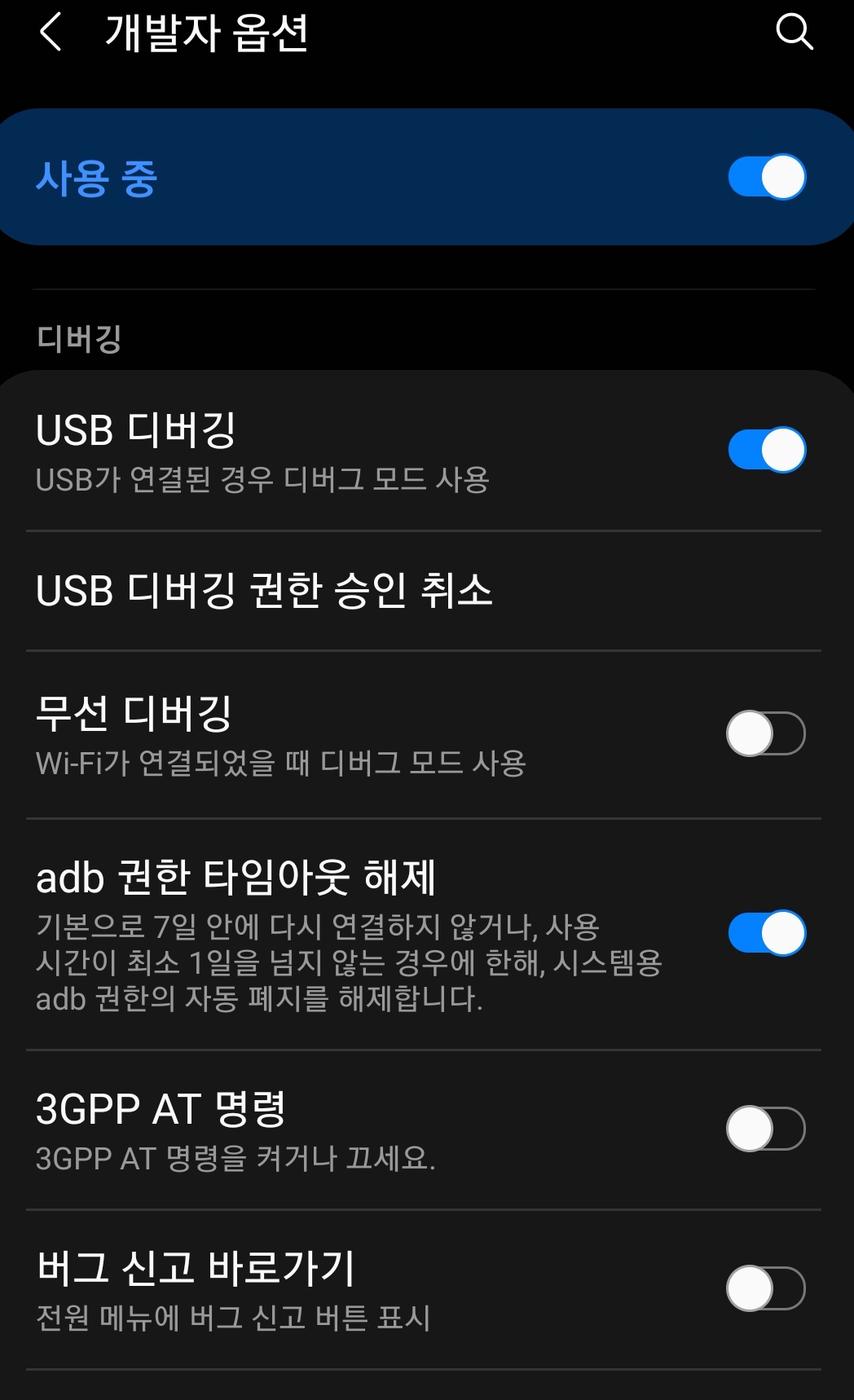 핸드폰 설정에 맨 아래부분에 개발자옵션이 활성화되면 개발자옵션에 들어가서 USB 디버깅 모드를 켜주면 된다.