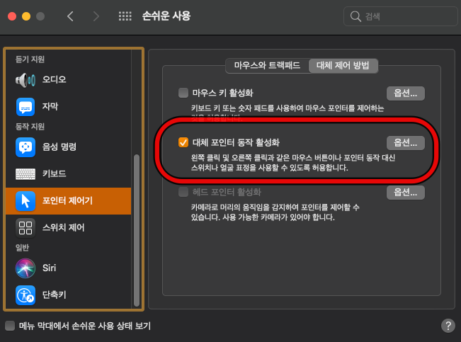 다음에 상단에 대체 제어방법을 클릭한 후 대체 포인터 동작 활성화 버튼을 눌러준다.
