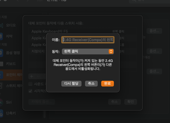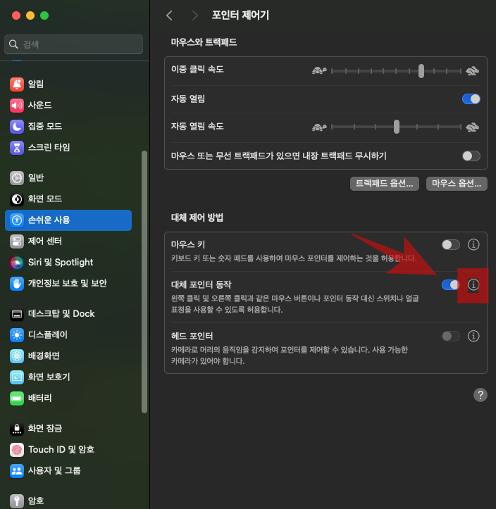 업데이트 된 MAC OS에서는 환경설정 - 손쉬운 사용 - 포인터 제어기 - 대체 포인터 동작 후에 i 버튼을 눌려준다.