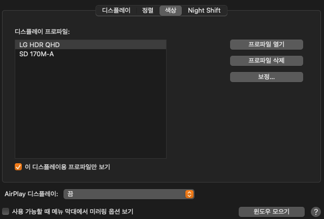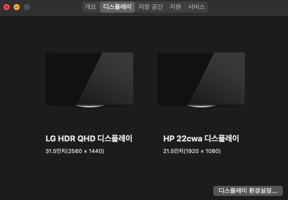 듀얼 모니터를 연결하였다면 연결 후 맥 좌측 상단에 이 맥에 관하여를 클릭해보면 디스플레이가 잘 연결되어있는 것을 확인할 수 있다.