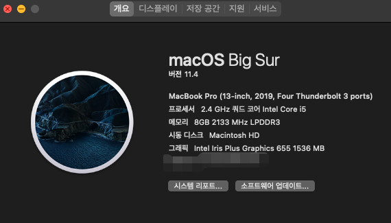 본인의 맥북사양은 맥북 프로 13인치 형인 데 MacBook Pro (13-inch, 2019, Four Thunderbolt 3 ports) 듀얼 모니터는 물론 외장하드와 키보드 모두 연결해서 사용하고 있다.