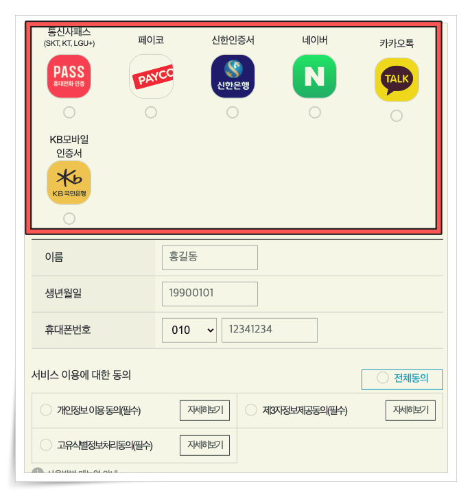 이를 응용하면 위와 같은 본인인증 사이트에도 macroreader를 이용해 클릭 한 번으로 이름, 생년원일, 휴대폰 번호 자동 입력이 가능하다.