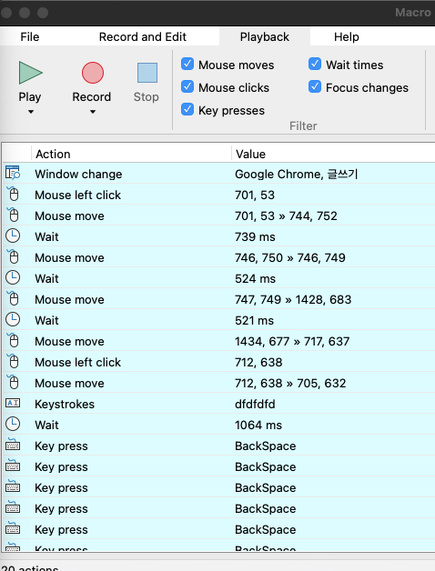 그러면 이제 마우스가 움직이는 것부터 해서 멈춘 시간(Wait time), 마우스 클릭한 것, 키보드 누른 것, 타이핑 한 키보드 등 모든 작업등이 녹화가 되는 것을 화면으로 확인할 수 있다.