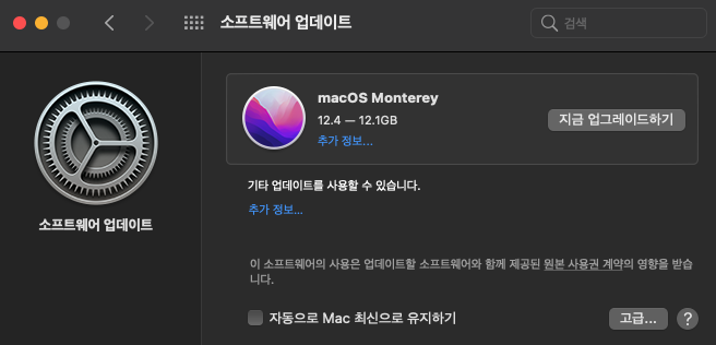 아직 몬테레이 전에 버전이라면 맥에서 화면 좌측 상단에 사과 모양을 클릭한 후 이 맥에 관하여를 누르면 업그레이드가 가능하다.