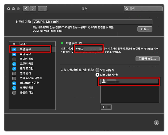 그리고 화면설명에 나와있는 vnc://123.456.789.11 등의 주소를 메모해두고 '다음 사용자의 접근을 허용'에 다음 사용자만을 선택해준 후 사용자의 이름과 비밀번호를 기억해둔다. 후에 위의 사용자의 이름과 암호를 입력해주어야 한다.