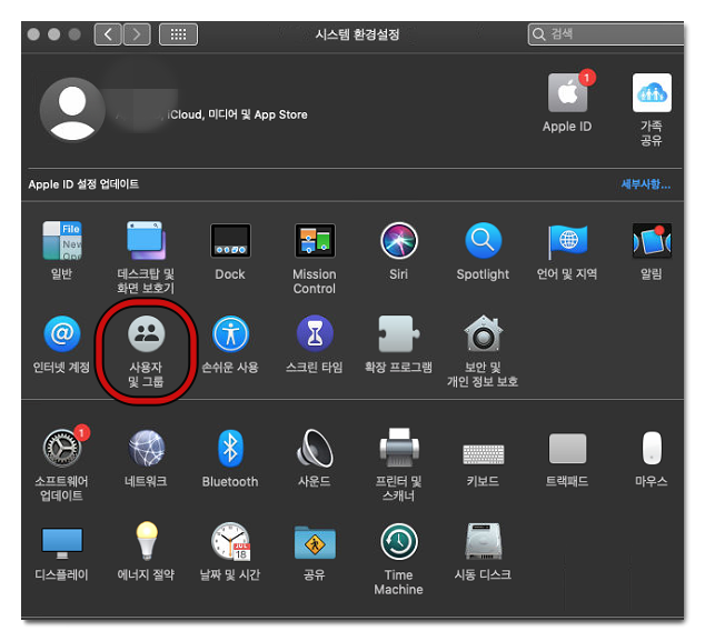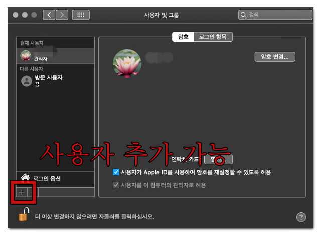 보통 사용자의 이름과 비밀번호는 제어하려는 컴퓨터의 로그인 아이디와 비밀번호와 같은 데 만약 비밀번호가 틀리거나 사용자를 다르게 설정하고 싶으면 환경설정 - 사용자 및 그룹에서 새로운 사용자를 추가하거나 수정할 수 있다.