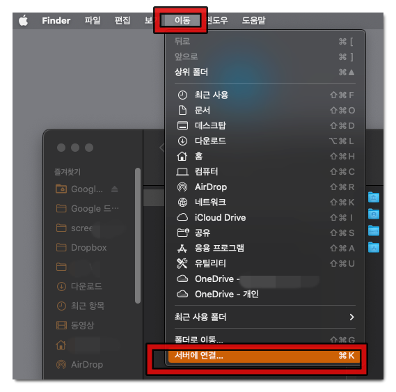 제어하는 컴퓨터의 파인더 - 이동 - 서버에 연결에 들어가 기록해놓은 vnc://123.456.789.11 를 입력해주면 된다.