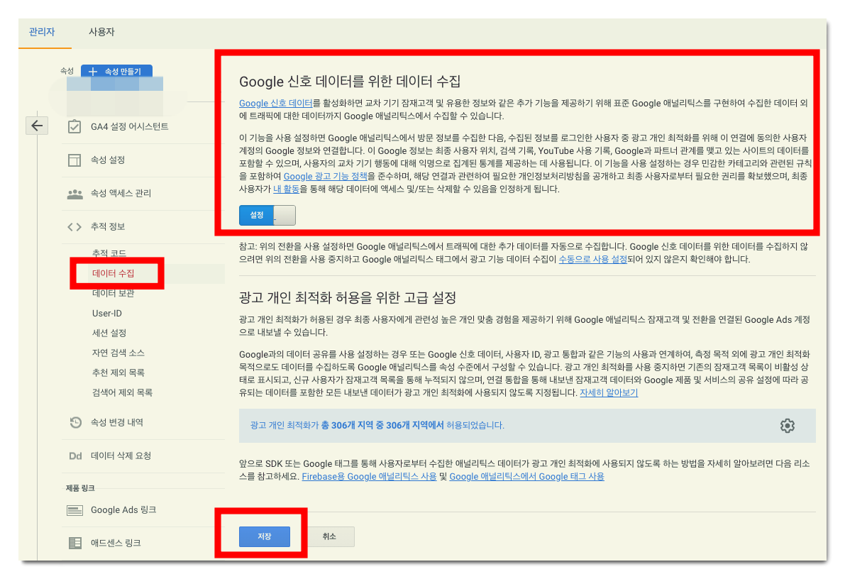 반드시 추적 코드 밑에 있는 데이터 수집설정을 완료해 주어야 데이터가 애널리스틱으로 전송된다.
