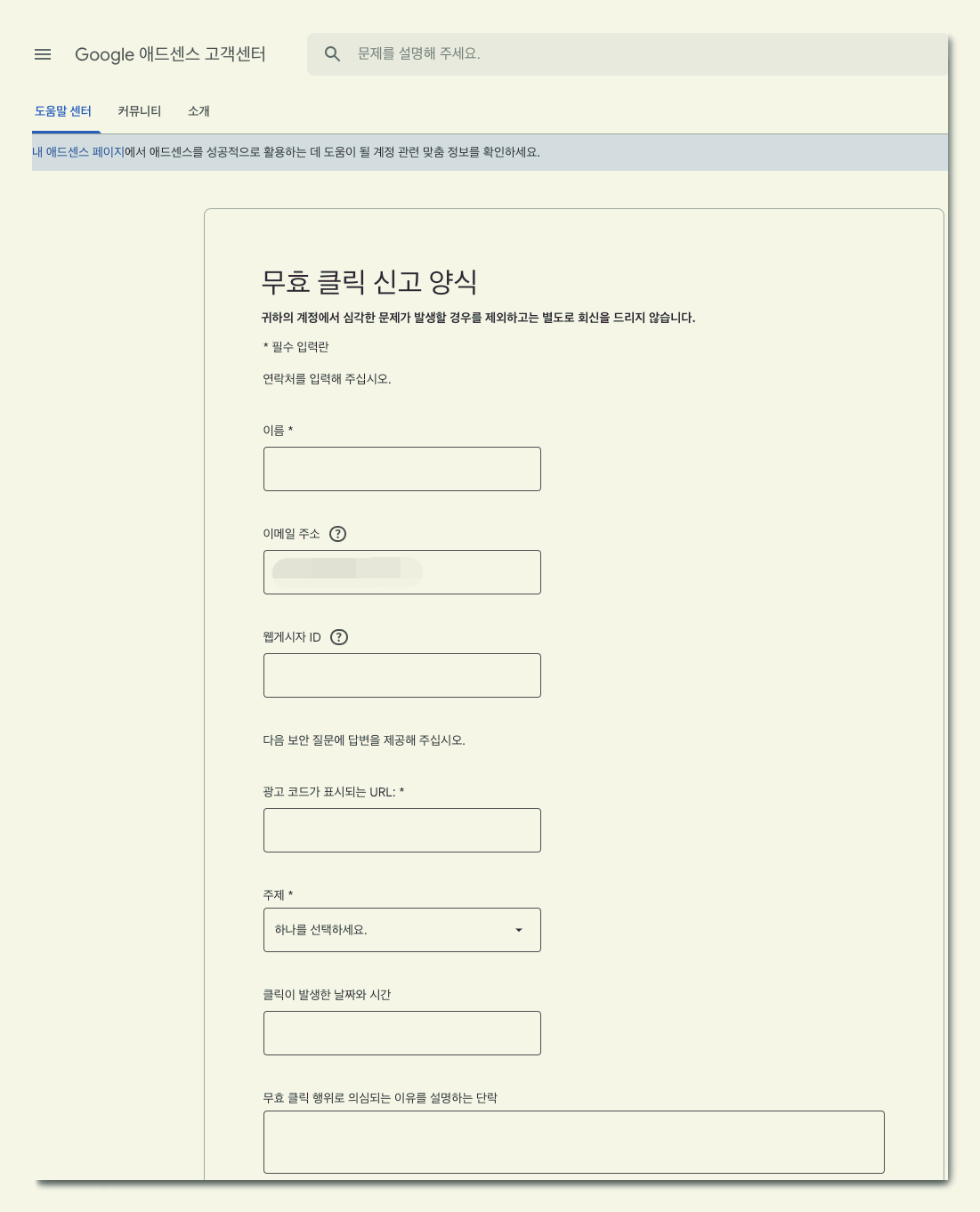 이렇게 발견한 IP를 무효클릭 신고양식을 통해이제 구글에 신고할 수 있다.