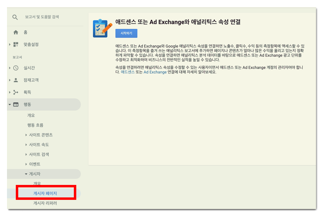 그리고 설정을 마치고 애널리스틱의 게시자 - 게시자 페이지를 보려면 애드센스와 구글 애널리틱스도 연결을 해주어야 데이터를 볼 수 있다. 계정에 있는 속성 중 애드센스 링크를 클릭하여 연결만 해주면 된다.