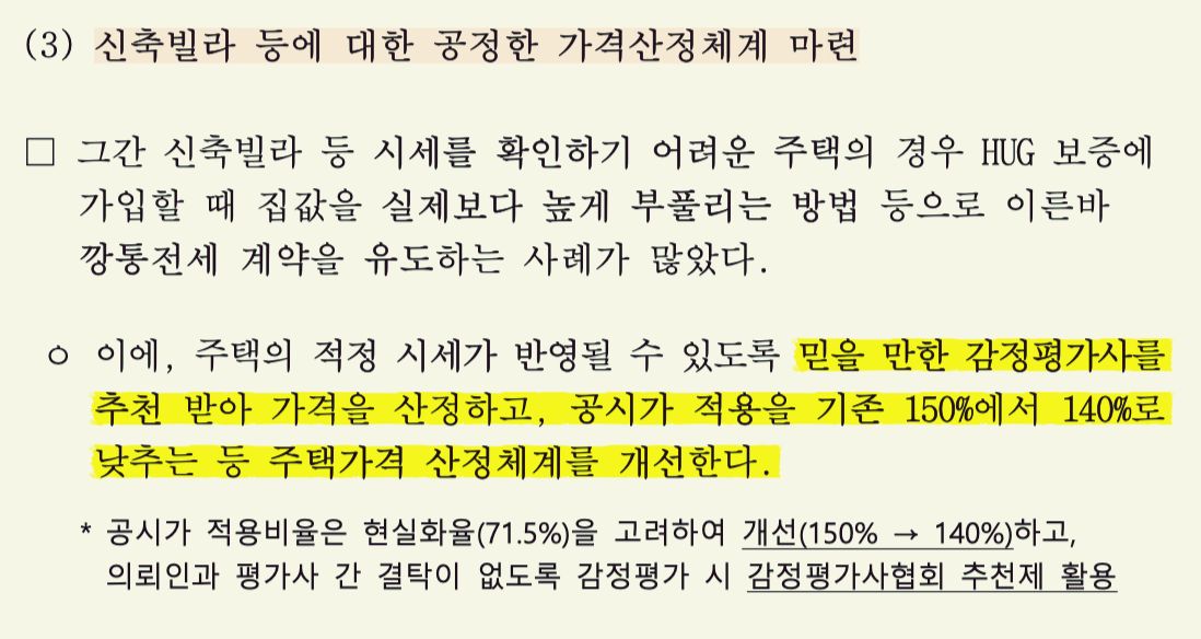 전세사기 피해방지방안에는 공시가 적용을 기존 150%에서 140%로 낮출 계획이라고 하지만 실행이 된다고 해도 공시가격보다 더 높은 금액을 보증보험에서 보증을 서주겠다는 것은 마찬가지이다.