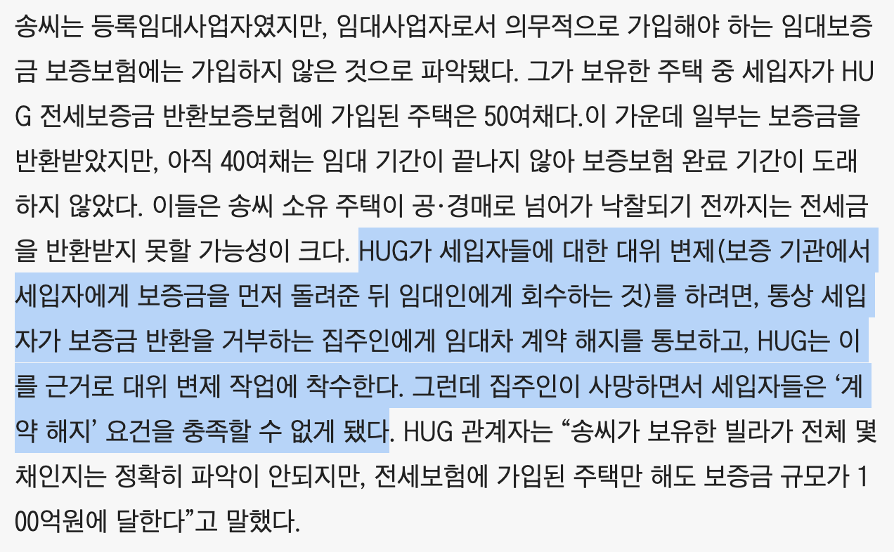최근 빌라왕이라는 사건으로 빌라 1100세대를 전세를 주고 주인이 되는 사람이 사망했다는 소식이 있었다. 전세금을 받은 진짜 빌라소유자가 누구인 지는 의문점이 들지만 기사에 따르면 세입자가 주택도시보증공사(HUG)의 전세보증금 반환보증보험에 가입되어 있음에도 집주인이 사망하여 세입자들이 전세금을 돌려받지 못하고 있다는 내용이다.