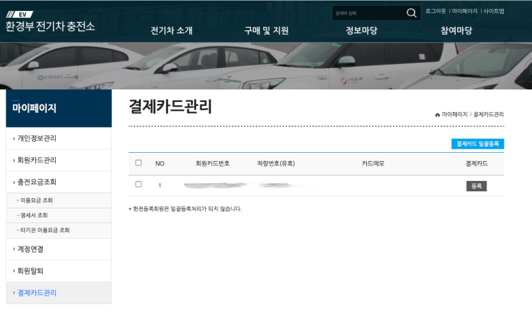 환경부 충전카드는 1인당 1장씩 받을 수 있으나 한 대의 전기차만 등록이 가능하다.