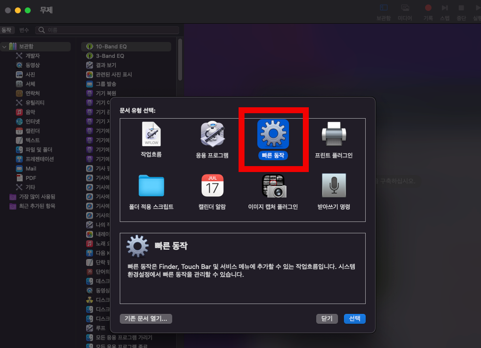 오토메이터 메뉴에서 보듯이 오토메이터는 맥의 여러 가지 기능을 커스텀 할 수 있다. 그중의 하나가 빠른 동작의 어플 실행기능인 것이다.