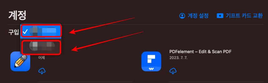 그러면 가족의 아이디 혹은 자신의 다른 아이디로도 설정이 가능하니 다른 아이디에서 구입했던 어플을 다시 다운로드하기 위해 앱 스토어에서 로그인 로그아웃을 하지 않고 다운로드한 어플을 선택하여 다운로드할 수 있다.