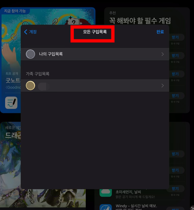 그러면 이제 애플의 어플 스토어에서 아이패드의 경우에는 우측 상단의 본인 계정을 클릭하여 구입항목에 들어가면 다른 가족멤버의 구입항목에 엑세스하여 다운로드가 가능하고 맥의 경우에는 앱 스토어 좌측 하단의 본인의 이름이나 계정사진을 클릭한 후 들어가서 구입 목록에 다른 가족 멤버를 선택을 할 수가 있게 된다.