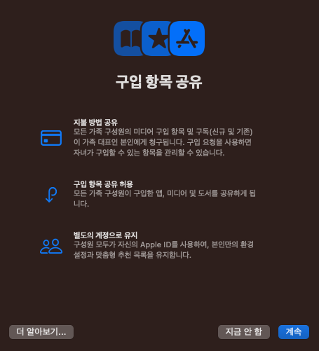 애플이 다른 어플을 공유하기 어렵게 만들어 놓은 것 같기도 하나, 해당 오류들은 가족을 새로 만들고 지불설정방법도 새로 해주고 다 해주어도 해결되지 않았다.