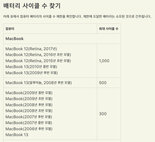 확인된 싸이클을 토대로 맥북 제품별 최대 싸이클 수를 확인할 수 있다.