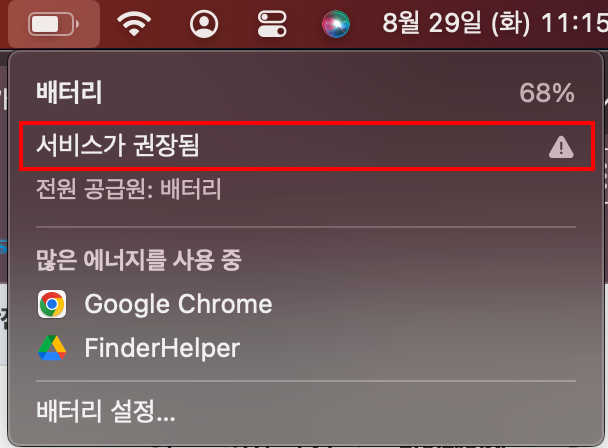 그리고 배터리 상태에는 서비스가 필요함이라는 문구가 쓰여있었다.