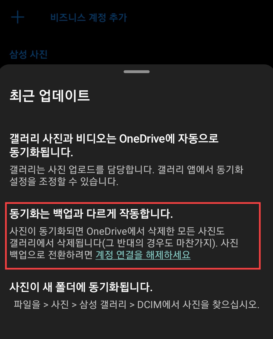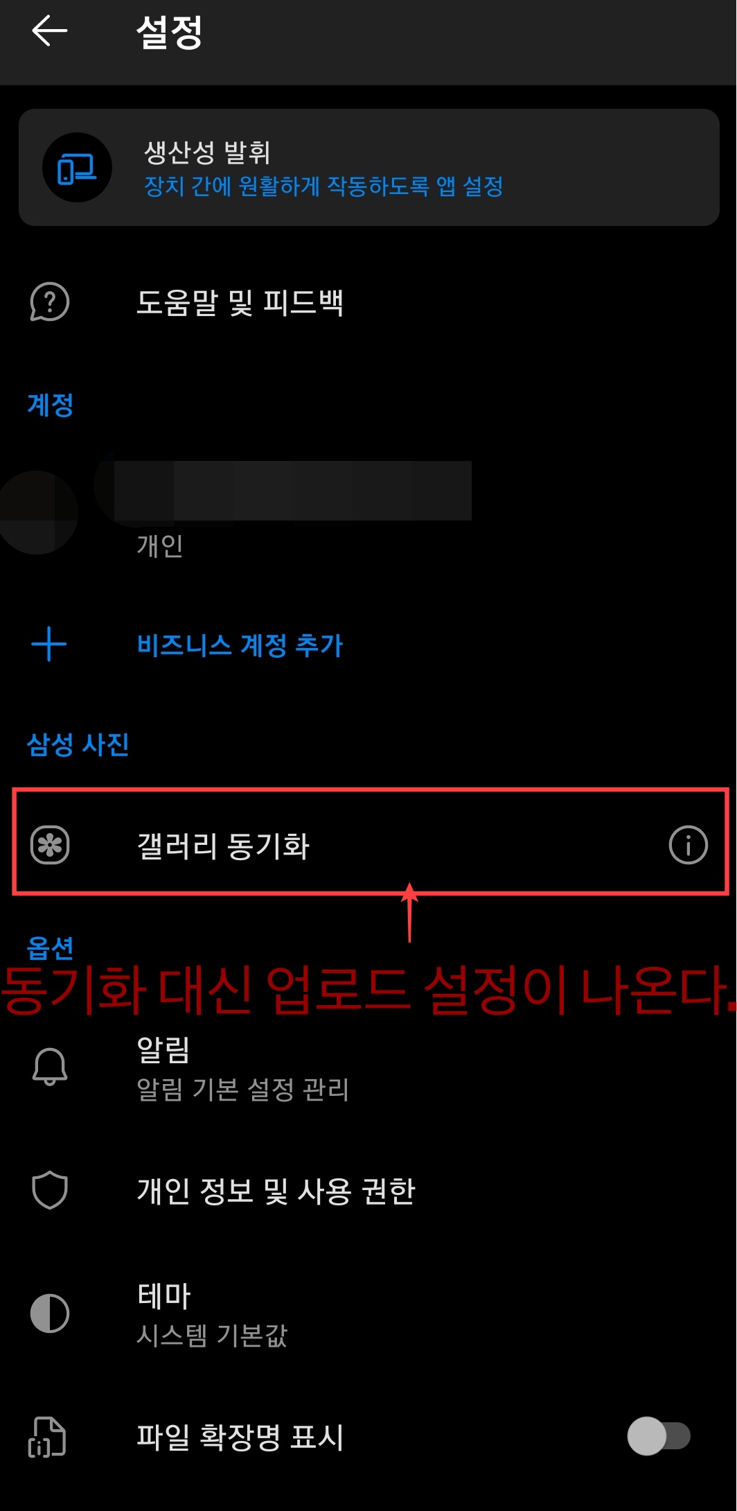 방법은 위의 동기화 방법처럼 갤럭시 갤러리 어플에서 동기화 버튼을 누르지 않는 상태에서 핸드폰에 원드라이브 어플을 설치한 후 원드라이브 어플의 설정에서 사진 업로드 백업을 선택해 주면 된다.