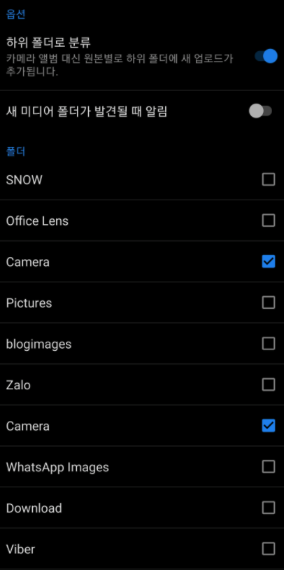 여러 폴더들이 나오는 데 이것은 사진을 이용하는 어플에서 찍은 사진들을 원드라이브에서 동기화할 어플만 선택해주면 된다.
