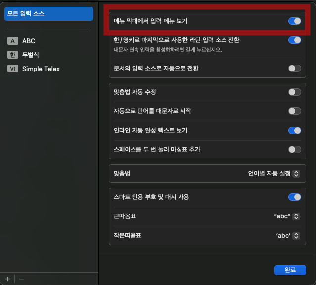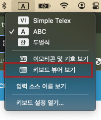 만약 화면 우측 상단에 입력키가 보이지 않는다면 맥 시스템 설정에서 키보드를 선택한 후 텍스트 입력- 입력소스 - 편집을 누른 후