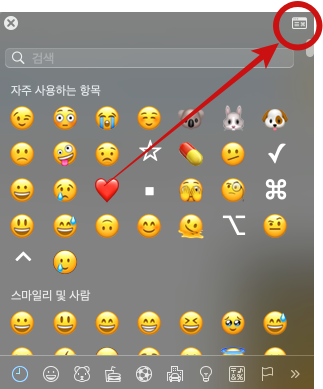 Control-Command-Space 를 누르면 다음과 같이 이모지를 입력할 수 있는 화면이 나오는 데 여기에서 우측 상단에 버튼을 누르면 더 많은 이모지와 기호 등을 선택할 수 있다.