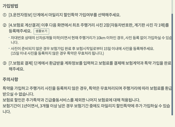 1. 운전자 정보 등록 단계에서 마일리지 할인특약 가입 여부를 선택하세요.