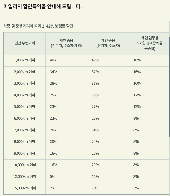 • 연간 1,000km 이하 주행 시 최대 42% 할인.
