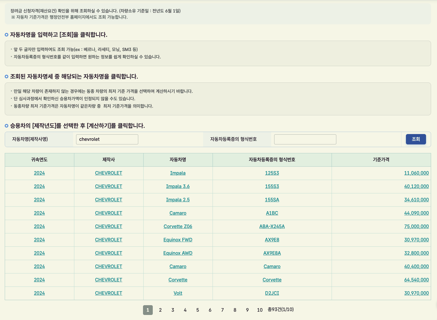 여기서 해당 차량 모델이나 제조사를 입력하면 귀속연도에 따른 잔가율을 계산하여 차량 가격을 알 수 있다.