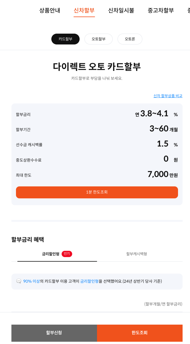 • 오토할부: 할부금리는 카드할부와 유사하게 연 3.8%~4.1%이며, 상환 기간도 3개월부터 60개월까지 선택 가능합니다. 그러나 중도상환 시 수수료가 부과될 수 있습니다.