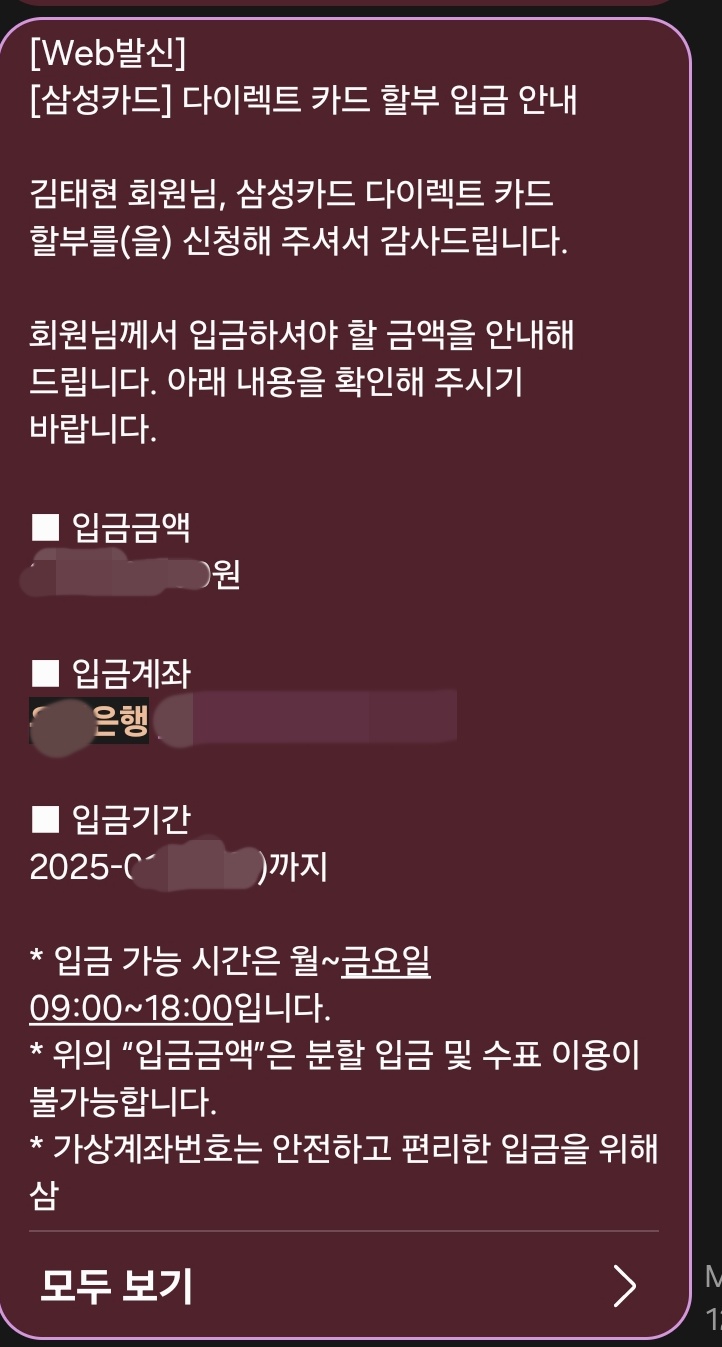 신청하고 나면 일시불 금액 입금을 위한 가상계좌가 문자로 안내되며 해당 가상계좌에 입금을 하고 안내되는 URL로 인증번호 4자리를 입력하면 비로소 차량금 납입을 위한 일시불 한도상향이 이루어지며 가상 카드 번호가 문자로 온다..